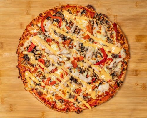 homemade tomato base, mushroom, roasted capsicum, caramelised onions, fresh chicken , peri peri sauce and bocconcini on top