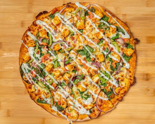 spicy sauce, marinated paneer, diced tomatoes, spanish onion, capsicum, spinach, chilli, cheese with mint yogurt sauce on top