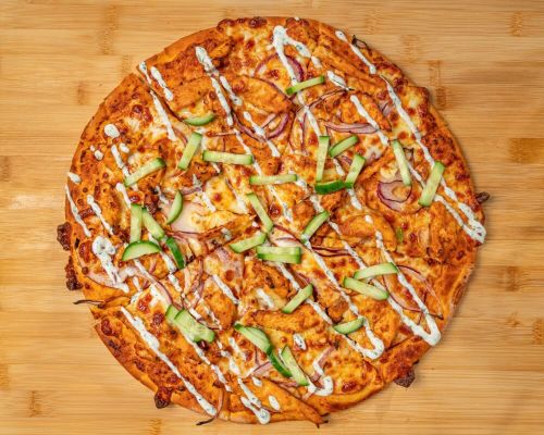 tomato base, cheese, marinated chicken, spinach, red onion with mint yogurt sauce