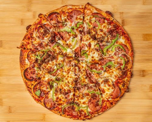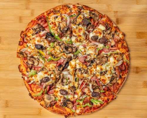 homemade pizza sauce, ham, cabanossi, mushroom, onion, capsicum, cheese, olives, pepperoni, anchovies