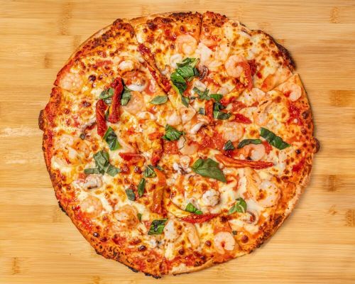 Tomato garlic base, cheese, baby octopus, king prawns,school prawns, sweet chilly swirl with fresh basil and sun dried tomatoes on top.