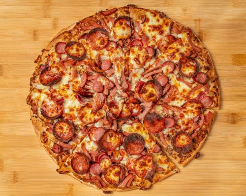 homemade pizza sauce, ham, cabanossi, mushroom, onion, capsicum, cheese, olives