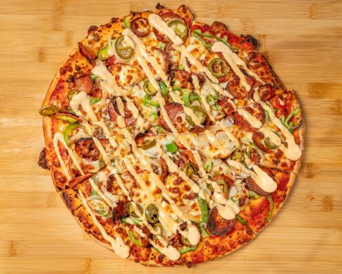 tomato base, cheese, onion, capsicum, homemade ground beef, pepperoni, chorizo, jalapenos with peri peri sauce on top